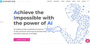 Achievion Solutions’ three main services include AI product development, AI strategy consulting and AI enablement. The company’s five-point manifesto includes things like “anything is possible” and “become a reliable partner to the client.” Achievion Solutions was named one of the top U.S. mobile app developers by Clutch